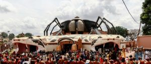 Pour pénétrer dans le musée des Rois Bamouns, dans l'ouest du Cameroun, on passe sous les crochets des gueules béantes...