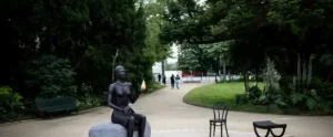 Une femme noire tenant un rameau d'olivier et une flamme dorée, assise au milieu de six sièges symbolisant tous les...