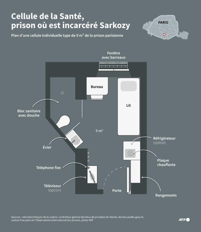 Son placement au quartier de l’isolement de la prison, le seul à même d’assurer sa sécurité, est « tout sauf un traitement de faveur », a poursuivi l’avocat.  Selon son conseil, Nicolas Sarkozy aura « une heure de sortie par jour dans une cour grillagée, seul », le reste du temps il sera « enfermé en cellule », sans contact avec les autres détenus. Il bénéficiera de « trois droits de visite par semaine de sa famille ».